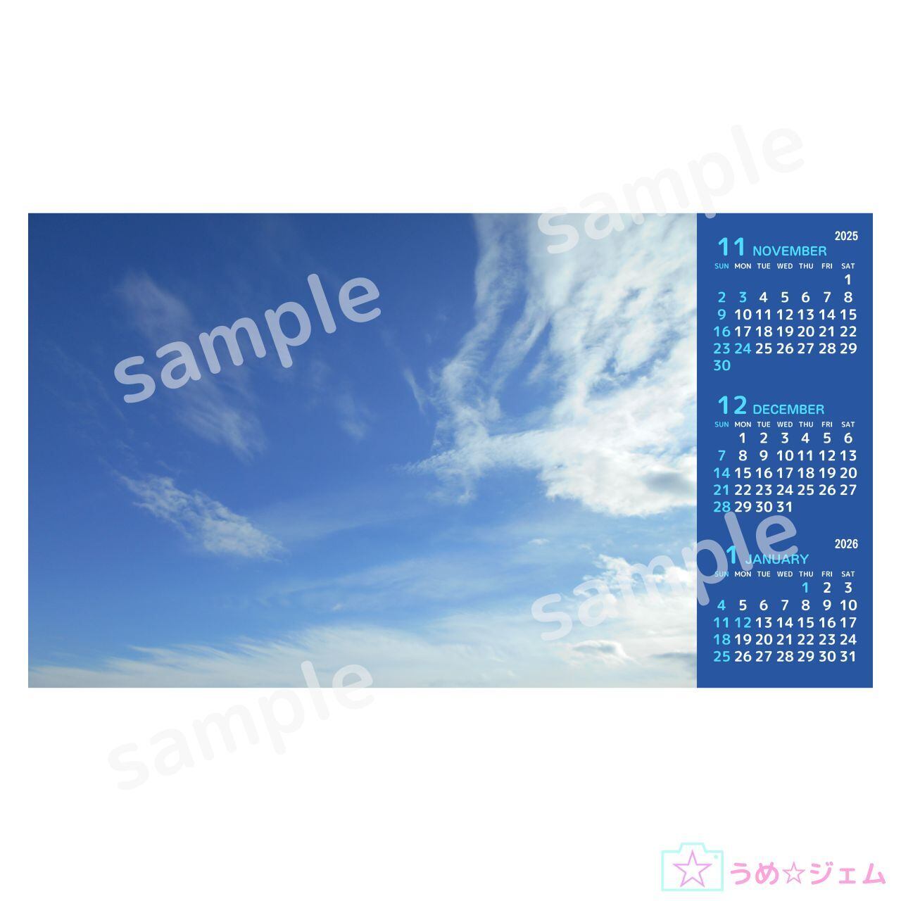 2025年11月~2026年1月の3か月カレンダーです。